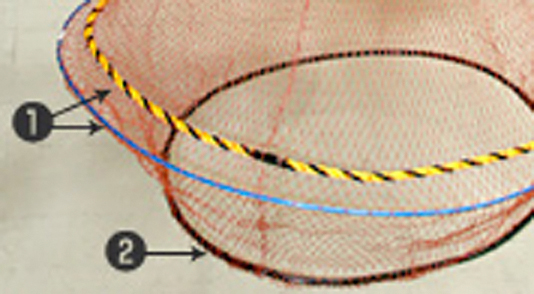 上下に重しの二段方式。上段は、ワイヤーと標識ロープで二重に(1)。下段は、ビニル被覆で網を保護します(2)。軽いごみでも飛ばされにくい作りになっています。